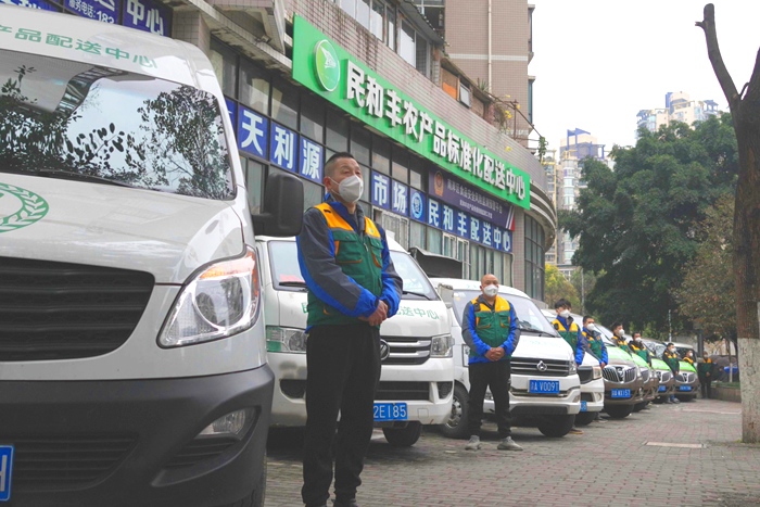 重庆民和丰农产品标准化配送中心线上下单,次日配送、价格透明,配送单商品名称、价格、食物、重量一致(每件食材包装上商品标贴、日期、重量),配送工作人进入食堂均必须佩带健康证。